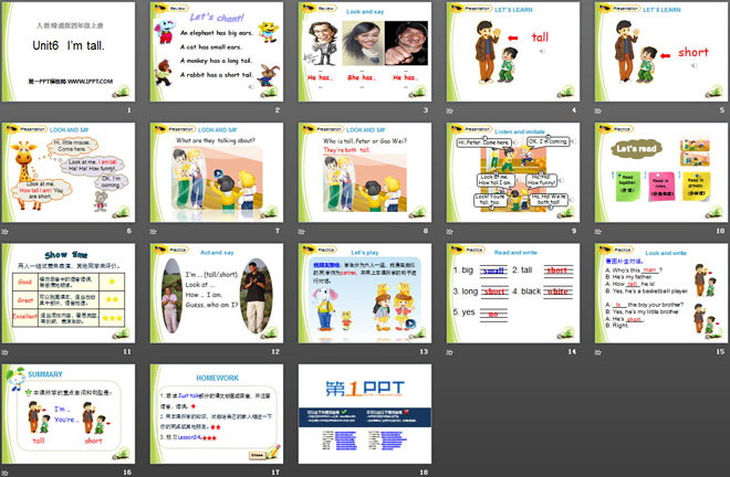 关键词:《I'm tall》教学课件,人教精通版四年级上册英语PPT课件下载,四年级英语幻灯片课件下载,《I'm tall》PPT课件下载,.PPT格式;