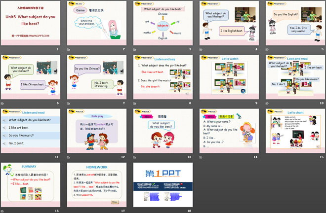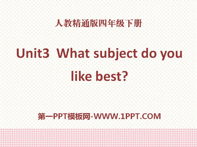 关键词:《What subject do you like best》教学课件,人教精通版四年级下册英语PPT课件下载,四年级英语幻灯片课件下载,《What subject do you like best》PPT课件下载,.PPT格式;