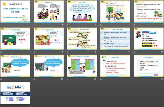 关键词:《What subject do you like best》教学课件,人教精通版四年级下册英语PPT课件下载,四年级英语幻灯片课件下载,《What subject do you like best》PPT课件下载,.PPT格式;