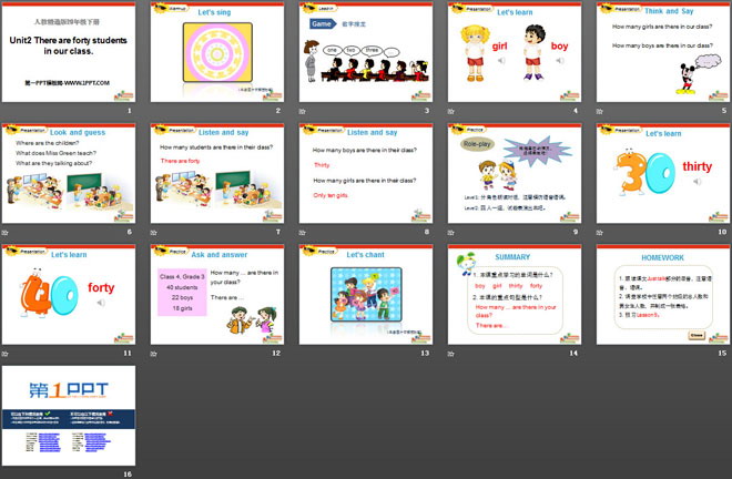 关键词:《There are forty students in our class》教学课件,人教精通版四年级下册英语PPT课件下载,四年级英语幻灯片课件下载,《There are forty students in our class》PPT课件下载,.PPT格式;
