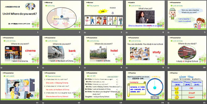 关键词:《Where do you work?》教学课件,人教精通版五年级上册英语PPT课件下载,五年级英语幻灯片课件下载,《Where do you work?》PPT课件下载,.PPT格式;