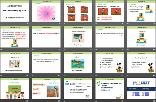 关键词:《I'm cleaning my room》教学课件,人教精通版五年级下册英语PPT课件下载,五年级英语幻灯片课件下载,《I'm cleaning my room》PPT课件下载,.PPT格式;