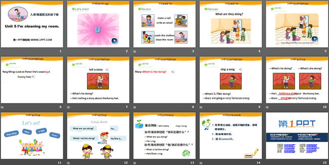 关键词:《I'm cleaning my room》教学课件,人教精通版五年级下册英语PPT课件下载,五年级英语幻灯片课件下载,《I'm cleaning my room》PPT课件下载,.PPT格式;