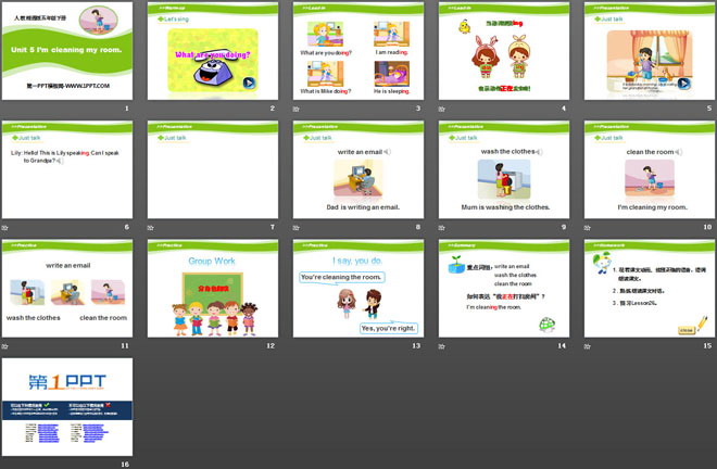 关键词:《I'm cleaning my room》教学课件,人教精通版五年级下册英语PPT课件下载,五年级英语幻灯片课件下载,《I'm cleaning my room》PPT课件下载,.PPT格式;