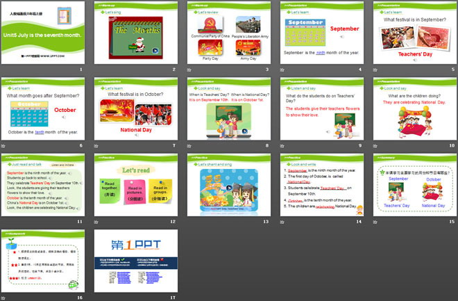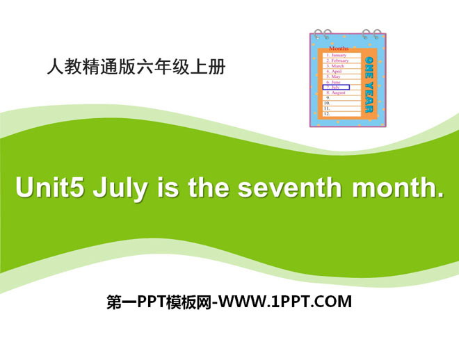 关键词:《July is the seventh month》教学课件,人教精通版六年级上册英语PPT课件下载,六年级英语幻灯片课件下载,《July is the seventh month》PPT课件下载,.PPT格式;