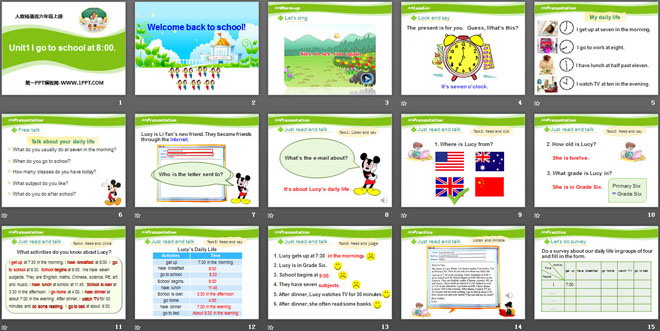 关键词:《I go to school at 8:00》教学课件,人教精通版六年级上册英语PPT课件下载,六年级英语幻灯片课件下载,《I go to school at 8:00》PPT课件下载,.PPT格式;