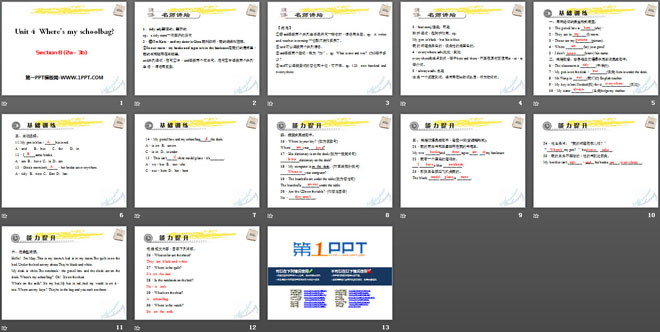 关键词:《Where's my schoolbag?》教学课件,人教新目标版七年级上册英语PPT课件下载,七年级英语幻灯片课件下载,《Where's my schoolbag?》PPT课件下载,.PPT格式;