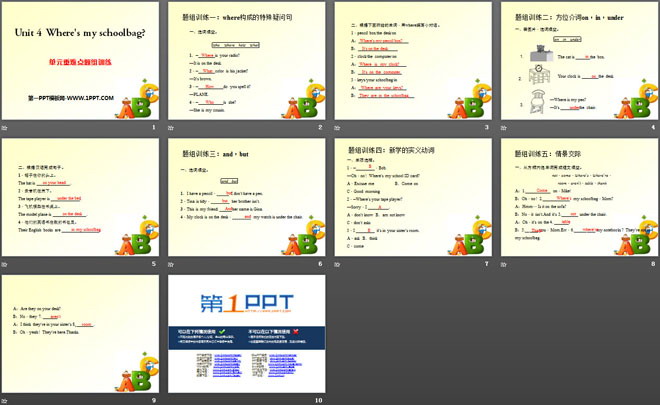 关键词:《Where's my schoolbag?》教学课件,人教新目标版七年级上册英语PPT课件下载,七年级英语幻灯片课件下载,《Where's my schoolbag?》PPT课件下载,.PPT格式;
