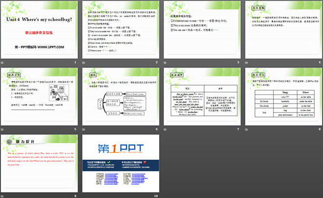 关键词:《Where's my schoolbag?》教学课件,人教新目标版七年级上册英语PPT课件下载,七年级英语幻灯片课件下载,《Where's my schoolbag?》PPT课件下载,.PPT格式;
