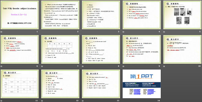 关键词:《My favorite subject is science》教学课件,人教新目标版七年级上册英语PPT课件下载,七年级英语幻灯片课件下载,《My favorite subject is science》PPT课件下载,.PPT格式;