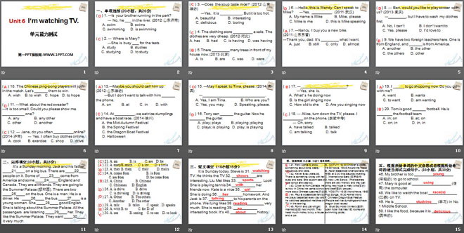 It is Sunday today. Steve is 31. ______ TV. He thinks the TV 32. _______ are interesting. Liu Mei likes 33. _______. Look! She is playing tennis 34.________ her friends now. Kate is a nice 35. ______. She is doing 36. _______ homework. And Jack is 37. ________ to his parents on the phone. Wei Ling likes 38. ________ very much. She is reading 39. _____ interesting book. It’s 40._______ history.