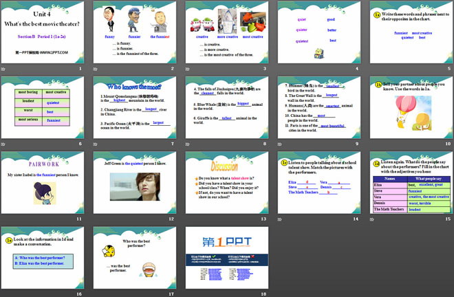 关键词:《What's the best movie theater?》教学课件,人教新目标版八年级上册英语PPT课件下载,八年级英语幻灯片课件下载,《What's the best movie theater?》PPT课件下载,.PPT格式;