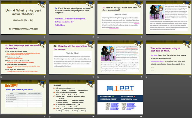 关键词:《What's the best movie theater?》教学课件,人教新目标版八年级上册英语PPT课件下载,八年级英语幻灯片课件下载,《What's the best movie theater?》PPT课件下载,.PPT格式;
