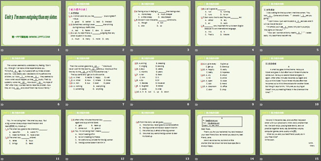 关键词:《I'm more outgoing than my sister》教学课件,人教新目标版八年级上册英语PPT课件下载,八年级英语幻灯片课件下载,《I'm more outgoing than my sister》PPT课件下载,.PPT格式;