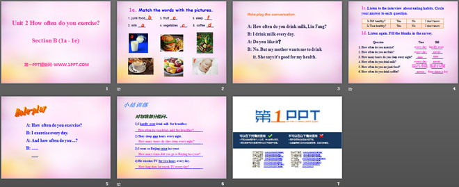 关键词:《How often do you exercise?》教学课件,人教新目标版八年级上册英语PPT课件下载,八年级英语幻灯片课件下载,《How often do you exercise?》PPT课件下载,.PPT格式;