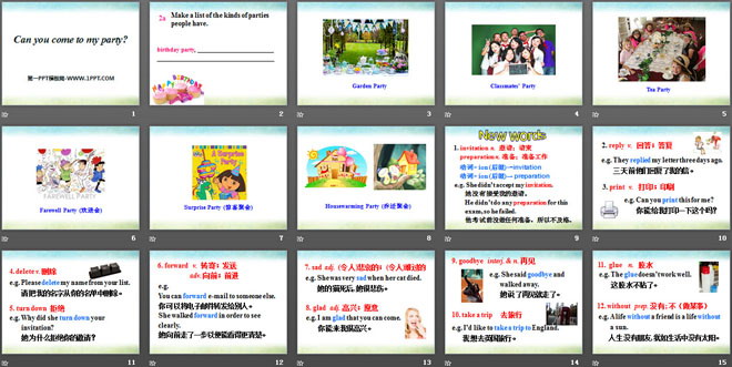 关键词:《Can you come to my party?》教学课件,人教新目标版八年级上册英语PPT课件下载,八年级英语幻灯片课件下载,《Can you come to my party?》PPT课件下载,.PPT格式;