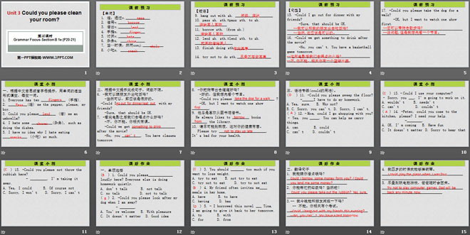 关键词:《Could you please clean your room?》教学课件,人教新目标版八年级下册英语PPT课件下载,八年级英语幻灯片课件下载,《Could you please clean your room?》PPT课件下载,.PPT格式;