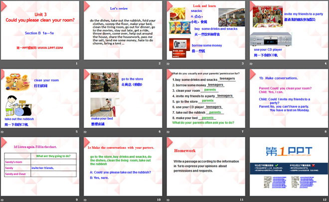 关键词:《Could you please clean your room?》教学课件,人教新目标版八年级下册英语PPT课件下载,八年级英语幻灯片课件下载,《Could you please clean your room?》PPT课件下载,.PPT格式;