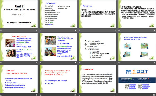 关键词:《I'll help to clean up the city parks》教学课件,人教新目标版八年级下册英语PPT课件下载,八年级英语幻灯片课件下载,《I'll help to clean up the city parks》PPT课件下载,.PPT格式;