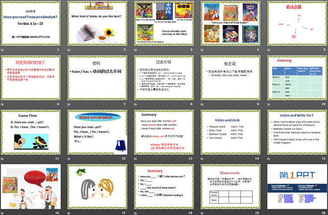 关键词:《Have you read Treasure Island yet?》教学课件,人教新目标版八年级下册英语PPT课件下载,八年级英语幻灯片课件下载,《Have you read Treasure Island yet?》PPT课件下载,.PPT格式;