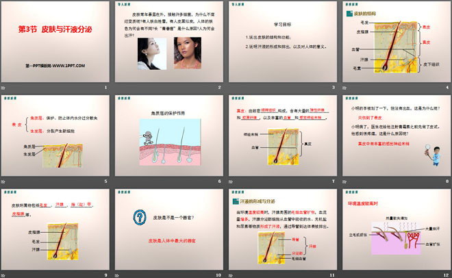 关键词:北师大版七年级下册生物PPT课件免费下载,皮肤与汗液分泌PPT下载,.PPT格式;