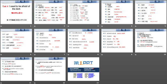 关键词:《I used to be afraid of the dark》教学课件,人教新目标版九年级全一册英语PPT课件下载,九年级英语幻灯片课件下载,《I used to be afraid of the dark》PPT课件下载,.PPT格式;