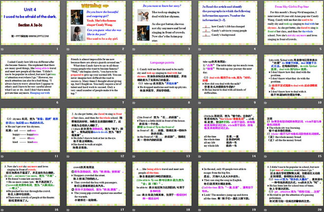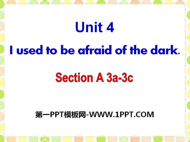 关键词:《I used to be afraid of the dark》教学课件,人教新目标版九年级全一册英语PPT课件下载,九年级英语幻灯片课件下载,《I used to be afraid of the dark》PPT课件下载,.PPT格式;