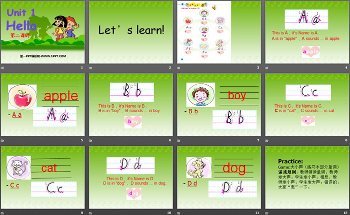 游戏规则:教师领读单词,教师发大声,学生发小声,相反,教师发小声,学生发大声。错误的,大家“轰”一下。