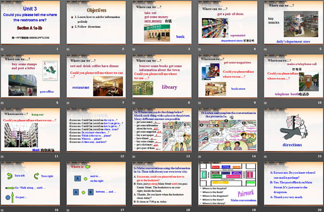 关键词:《Could you please tell me where the restrooms are?》教学课件,人教新目标版九年级全一册英语PPT课件下载,九年级英语幻灯片课件下载,《Could you please tell me where the restrooms are?》PPT课件下载,.PPT格式;