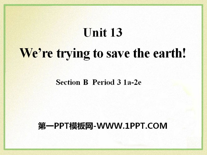 关键词:《We're trying to save the earth!》教学课件,人教新目标版九年级全一册英语PPT课件下载,九年级英语幻灯片课件下载,《We're trying to save the earth!》PPT课件下载,.PPT格式;