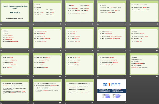 关键词:《You are supposed to shake hands》教学课件,人教新目标版九年级全一册英语PPT课件下载,九年级英语幻灯片课件下载,《You are supposed to shake hands》PPT课件下载,.PPT格式;