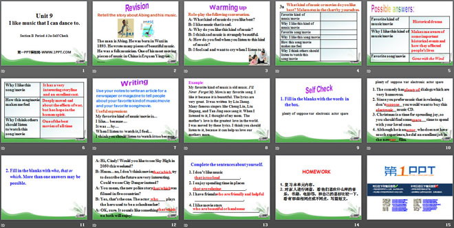 关键词:《I like music that I can dance to》教学课件,人教新目标版九年级全一册英语PPT课件下载,九年级英语幻灯片课件下载,《I like music that I can dance to》PPT课件下载,.PPT格式;