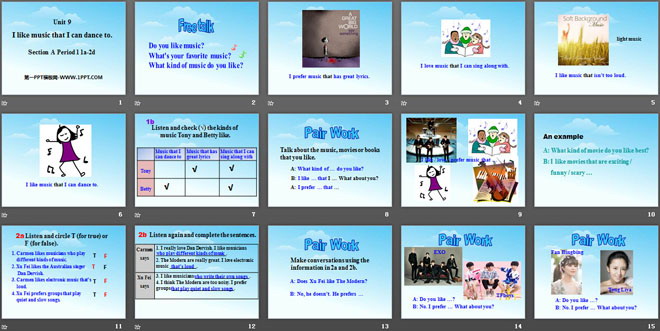 关键词:《I like music that I can dance to》教学课件,人教新目标版九年级全一册英语PPT课件下载,九年级英语幻灯片课件下载,《I like music that I can dance to》PPT课件下载,.PPT格式;