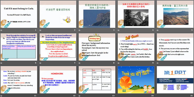 关键词:《It must belong to Carla》教学课件,人教新目标版九年级全一册英语PPT课件下载,九年级英语幻灯片课件下载,《It must belong to Carla》PPT课件下载,.PPT格式;