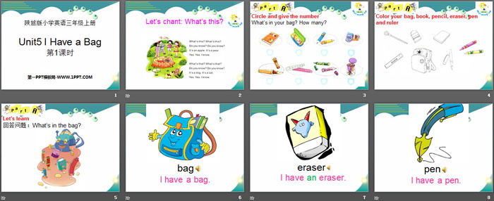 关键词:陕旅版三年级上册英语PPT课件免费下载,《I Have a Bag》PPT下载,.PPT格式;