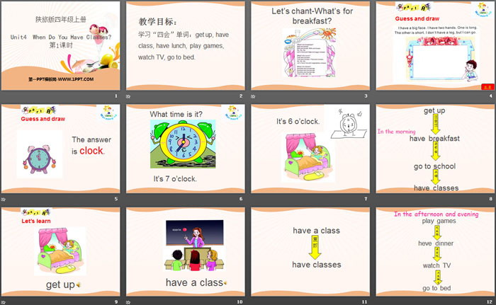关键词:陕旅版四年级上册英语PPT课件免费下载,《When Do You Have Classes?》PPT下载,.PPT格式;