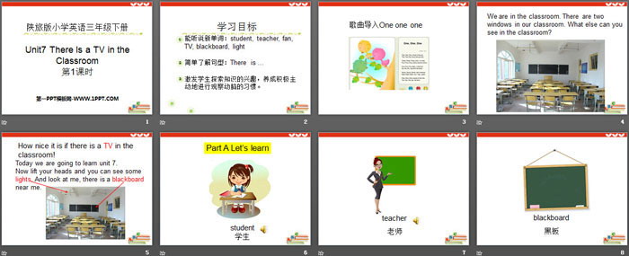 关键词:陕旅版三年级下册英语PPT课件免费下载,《There Is a TV in the Classroom》PPT下载,.PPT格式;