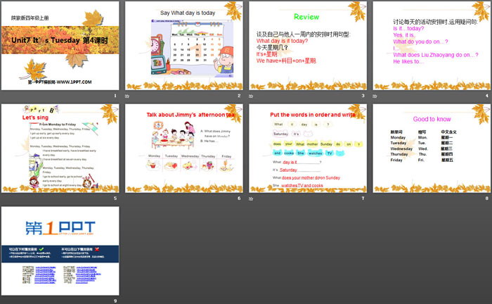关键词:陕旅版四年级上册英语PPT课件免费下载,《It's Tuesday》PPT下载,.PPT格式;