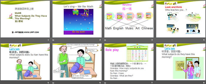 关键词:陕旅版四年级上册英语PPT课件免费下载,《What Subjects Do They Have This Morning?》PPT下载,.PPT格式;