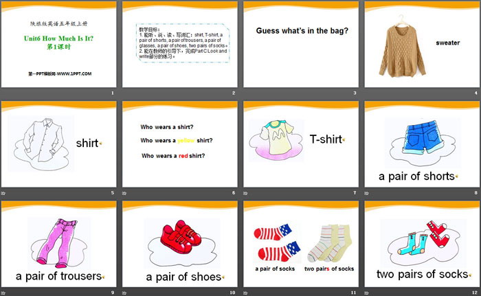 1. 能听、说、读、写词汇:shirt, T-shirt, a pair of shorts, a pair of trousers, a pair of glasses, a pair of shoes, two pairs of socks。