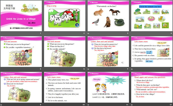 关键词:陕旅版五年级下册英语PPT课件免费下载,《He Lives in a Village》PPT下载,.PPT格式;