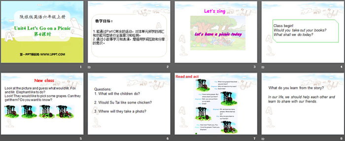 关键词:陕旅版六年级上册英语PPT课件免费下载,《Let's Go on a Picnic》PPT下载,.PPT格式;