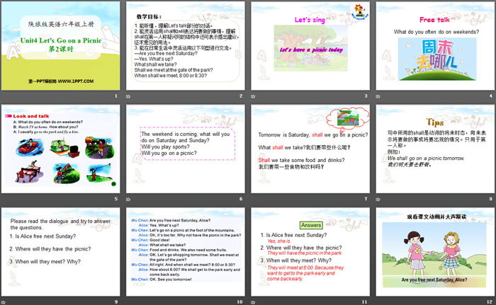 关键词:陕旅版六年级上册英语PPT课件免费下载,《Let's Go on a Picnic》PPT下载,.PPT格式;