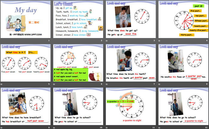 关键词:上海教育版四年级下册英语PPT课件免费下载,《My day》PPT下载,.PPT格式;