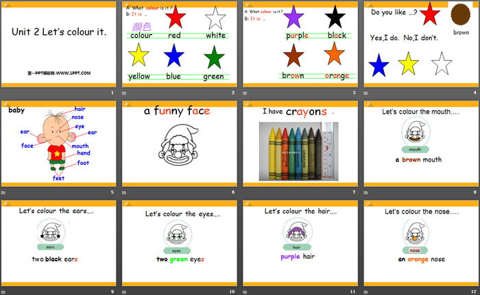 关键词:广州版三年级下册英语PPT课件免费下载,《Let's colour it》PPT下载,.PPT格式;