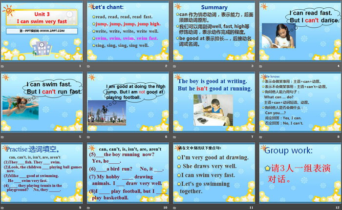 关键词:广州版五年级上册英语PPT课件免费下载,《I can swim very fast》PPT下载,.PPT格式;