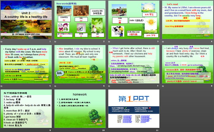 关键词:广州版六年级上册英语PPT课件免费下载,《A country life is a healthy life》PPT下载,.PPT格式;
