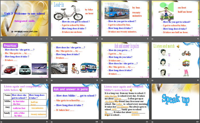 It is a long way from my home to school. I ___________ to school every day. It takes me about ___________. I often get up at ________. My friend Amy lives near our school. She ______ to school every morning. It takes her __________. She always gets to school ________. Sandy goes to school _______. It takes her about ____________ to get to school .