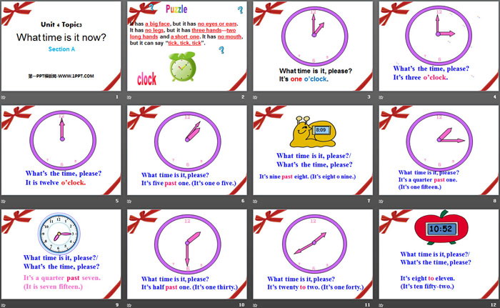 关键词:仁爱版七年级上册英语PPT课件免费下载,《What time is it now?》PPT下载,.PPT格式;