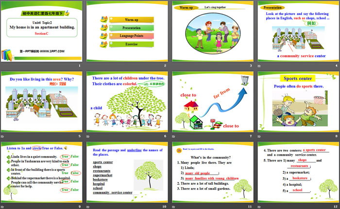 关键词:仁爱版七年级下册英语PPT课件免费下载,《My home is in an apartment building》PPT下载,.PPT格式;